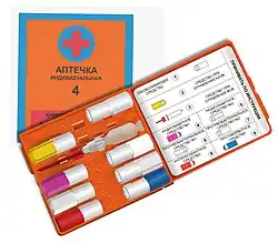 - Средство при отравлении ФОВ (гнездо № 3, шприц-тюбик с красным колпачком. Для внутримышечного использования. Принимается по сигналу Гражданской обороны); Пеликсим АЛ-85.