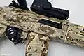 - на цевье снизу имеется дополнительная планка Пикатинни для установки аксессуаров — передней рукояти, фонаря, лазерного указателя и т. п.;
