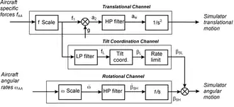 При разработке математического закона движения платформы тренажёра моделируемое на тренажёре уравнение движения ВС с помощью методов гармонического анализа раскладывают в ряд гармонических колебаний — гармоник. Первые гармоники — гармоники самой малой частоты вносят наибольший вклад в перемещение самолёта. При этом человек именно к этим длиннопериодическим колебаниям наименее чувствителен. Так, если медленно увеличивать перегрузку до небольших значений, то человек в положении сидя может даже не почувствовать её изменения. Высшие гармоники с ростом частоты вносят все меньший вклад в движение и они все более чувствительны для человека. Поэтому низшие гармоники подавляют, используя фильтр верхних частот.