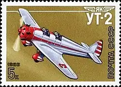 Спортивные самолёты конструктора А. С. Яковлева: • Двухместный самолёт Я-1 (1927 г.) • УТ-2 • Як-18 • Як-50 • Як-55 Марка (Mi #5660); (ЦФА № 5781) выпускалась в малом марочном листе (8 штук) |