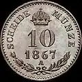 10 крейцеров[коммент. 8] | 18 | 2 | н/д | рубчатый | серебро 500-й пробы | 1867 A | 58 500[7] |