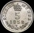 5 крейцеров | 16 | 1,3333 | н/д | рубчатый | серебро 375-й пробы | 1858—1860, 1863, 1864 | Суммарно[Тиражи 4] — не менее 8 223 939[7] |