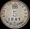 5 крейцеров[коммент. 7] | 16 | 1,3333 | н/д | рубчатый | серебро 375-й пробы | 1867 А | 69 375[7] |