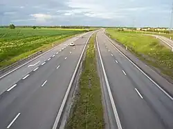 Автомагистраль — дорога, обозначенная знаком 5.1[17] и имеющая для каждого направления движения проезжие части, отделённые друг от друга разделительной полосой (а при её отсутствии — дорожным ограждением), без пересечений в одном уровне с другими дорогами, железнодорожными или трамвайными путями, пешеходными или велосипедными дорожками.