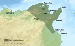 Когда он через шесть дней доплыл до мыса Бон на африканском побережье, то распорядился сжечь корабли. Этим он достигал двух целей. Во-первых, защита кораблей требовала солдат, а Агафокл не мог позволить себе разделять силы. Во-вторых, он понимал, что гибель кораблей лишала солдат какой-либо надежды на возвращение домой в случае поражения, что добавляло им мотивации побеждать[39][40]. Греки разграбили прилегающую сельскую местность и напали на Мегалополь. Жители города не ожидали штурма, да и не имели военного опыта. Затем войска сиракузян покорили и разграбили Белый Тунис, после чего разбили под его стенами лагерь[39][41]. Относительно места высадки армии Агафокла существует несколько предположений. Предположительно Мегалополь, который захватил Агафокл, соответствует современному Солиману, а Белый Тунис — Тунису[41][42]. Ряд историков отмечают несоответствие между расстоянием в 2 тысячи стадиев (~350 км) между Карфагеном и Белым Тунисом, указанным у Диодора Сицилийского, и расстоянием между Карфагеном и Тунисом (~20 км). Они указывают, что раз Диодор называет населённый пункт др.-греч. Λευκὸν Τύνητα, а не др.-греч. Τύνητα, то имеет в виду отличный от Туниса (античное название Тунет или Тунета) населённый пункт. Идентифицировать его локацию и соответствие современному населённому пункту не представляется возможным. По альтернативным подсчётам Белый Тунис должен находиться значительно восточнее современного Туниса, в области современного Триполи[43][44].