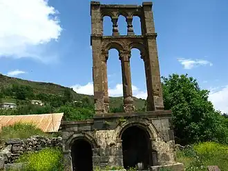 В селе находится надгробная постройка VII века[6]. Над двумя глубокими склепами устроена площадка со ступенчатым входом с задней стороны. Над ней возвышаются три устоя — два пилона и колонна между ними, соединенные арками, над которыми шёл карниз. Все сооружение венчалось тремя арками на фигурных колоннах, до нас не дошедших. Согласно народной легенде памятник воздвигли жители Агуди память о трёх князьях Сюника, победивших персидского правителя, двинувшегося на село с большим войском. Изображение этого памятника было помещено на банкноте 1000 драмов старого образца.