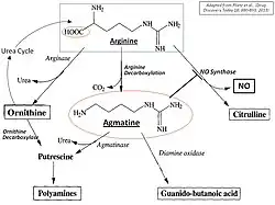 Биосинтез агматина путем декарбоксилирования аргинина конкурирует с другими аргининзависимыми путями, а именно: метаболизмом азота (цикл мочевины) и синтезом полиамина и оксида азота (NO). Разложение агматина происходит главным образом путем гидролиза, катализируемого агматиназой в мочевину и путресцин, диаминовый предшественник биосинтеза полиамина. Альтернативный путь(в основном, в периферических тканях) - катализируемое диаминоксидазой окисление в агматин-альдегид, который далее преобразуется альдегиддегидрогеназой в гуанидинобутират и секретируется почками.