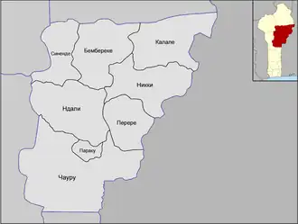 Находится в центральной части страны. Граничит на востоке с Нигерией; с департаментами: на севере — с Алибори, на северо-западе — с Атакора, на западе — с Донга и на юге — с департаментом Коллинз. Административный центр — город Параку. Включает 8 коммун:
