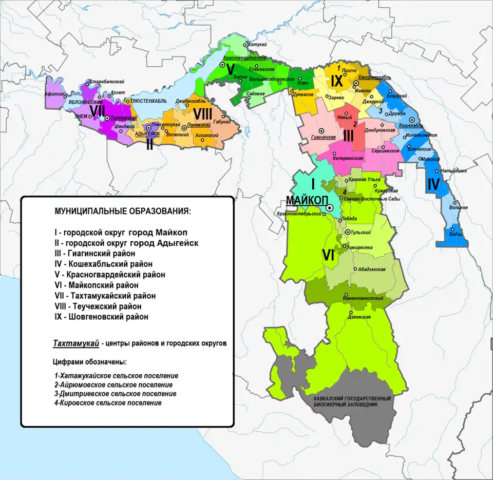 | 4 | Тахтамукайский | аул Тахтамукай | Афипсипский, Гатлукайский, Козет, Лакшукайский, Новобжегокайский, Пчегатлукайский, Старобжегокайский, Тахтамукайский, Шенджийский, Яблоновский |