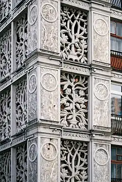 Исследователи отмечают высокую художественную детализацию дома Бурова. Свою выразительность фасады получили за счёт строгого чередования плоских блоков, окон и бетонных решёток растительного орнамента, благодаря которым здание и получило своё название[17][21]. Ажурный декор был выполнен по рисункам художника Владимира Фаворского и создавал аллюзию на архитектуру модерна. При этом рельефные элементы выполняли чисто практическую функцию, скрывая внутреннее пространство лоджий[2][22]. Второй отличительной чертой дома является оформление межоконных перемычек-пилястр, в верхней части декорированных круглыми медальонами и окрашенных под мрамор. Ряд исследователей указывает, что Буров планировал сохранить оригинальный цвет бетонных поверхностей. Но перед началом производства стало известно, что создать равномерный оттенок не получится, и архитектор решил добавить нерастворимый краситель[5][7]. Благодаря этому здание приобрело сходство с итальянским палаццо эпохи ренессанса, что необычно для московской архитектуры[23][2][1]. Горизонтальный тип конструктивных блоков представлен тягами с узором в виде листьев. С общим плоским решением фасадов контрастируют выпуклые решётки французских балконов, визуально придающие им объём[3].