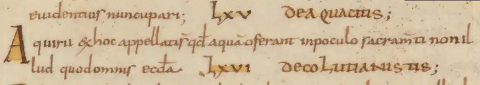 Августин в книге «De Haeresibus ad Quodvultdeum Liber Unus» («Ереси, попущением Бога, в одной книге») о акварианах: «Аквариане называются по причине, что в таинстве прелагают воду в чаше, а не так как делает вся Церковь» (лат. Aquarii ex hoc appellati sunt, quod aquam offerunt in poculo sacramenti, non illud quod omnis Ecclesia[1][2].). «Smaragdus». рукопись IX века