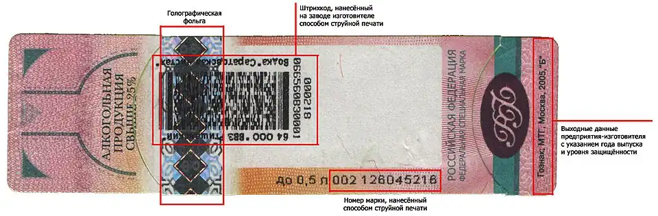 В декабре 2005 года Правительство РФ подписало два постановления, в которых предъявлялись новые требования к образцам акцизных и специальных марок. Согласно постановлениям, акцизными марками маркируется алкогольная продукция, ввозимая на территорию Российской Федерации, а федеральными специальными марками — алкогольная продукция с содержанием этилового спирта более 9 % объёма готовой продукции, производимой на территории Российской Федерации, за исключением алкогольной продукции поставляемой на экспорт.