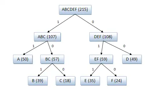 Полученные части рекурсивно делятся, и их частям назначаются соответствующие двоичные цифры в префиксном коде.