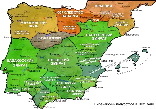 Халифат Кордовы фактически рухнул во время разрушительной гражданской войны между 1009 и 1013 годами, хотя окончательно не был отменён до 1031 года, когда Аль-Андалус распался на ряд в основном независимых мини-государств и княжеств, называемых тайфами. Вторгшиеся в 1013 году берберы расправились с жителями Кордовы, разграбили город и сожгли дворцовый комплекс[31]. После 1031 года тайфы, как правило, были слишком слабы, чтобы защитить себя от повторных набегов и требований дани от христианских государств на севере и западе, которые были известны мусульманам как «галисийские народы»[32], и которые распространились из своих первоначальных крепостей в Галисии, Астурии, Кантабрии, Стране Басков и Каролингской испанской марке и стали королевствами Наварры, Леона, Португалии, Кастилии и Арагона и графства Барселоны. В конечном итоге набеги превратились в завоевания, и в ответ правители тайф были вынуждены обратиться за помощью к Альморавидам, мусульманским берберским правителям Магриба. Однако в конечном итоге Альморавиды стали завоевывать и аннексировать тайфы.