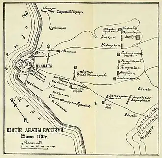 - ↑ ВОЕННО-ИСТОРИЧЕСКИЙ ОЧЕРК ГОРОДА АНАПЫ. Дата обращения: 5 октября 2019. Архивировано 25 сентября 2019 года.
