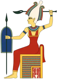 В египетских источниках, как и в угаритских, Анат характеризуется как воинственная[215]. Её также называли «госпожа небес»[216]. Утверждается, что этот титул может быть связан с её эпитетом, известным из угаритского текста KTU 1.108, b’lt šmm rmm, «госпожа высоких небес»[228]. В изобразительном искусстве Анат отображали в атефе[229], разновидности короны, связанной с Верхним Египтом[230], вооружённой либо копьём и щитом, либо боевым топором с отверстиями или, возможно, скипетром Уас, хотя этот предмет лучше известен в связи с Астартой[231]. Было отмечено, что древние египтяне обычно изображали божества, привнесённые из других областей, в соответствии с местными нормами, и их атрибуты более отражали характер, а не происхождение божества[232].