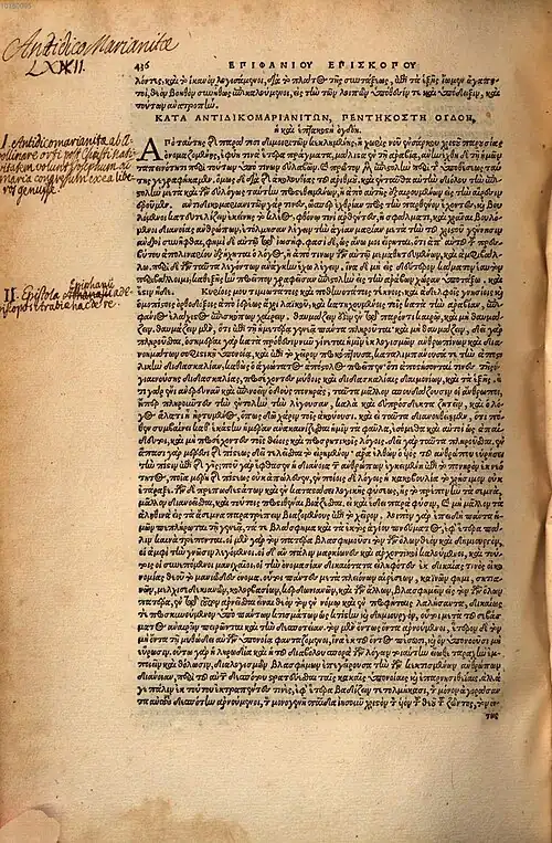 - ↑ PG 94. p. 677 «Περὶ αἱρέσεων ἐν συντομίᾳ ἑκατόν, ὅθεν ἤρξαντο καὶ πόθεν γέγονασιν». Дата обращения: 29 ноября 2015. Архивировано 7 апреля 2016 года.