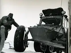 Для снижения массы вездехода были применены колёса необычной конструкции: вместо цельного обода — два кольца, соединённых между собой стальными трубками, вогнутыми внутрь колеса. Спицы сделаны из тех же стальных трубок. Вместо шин использовались обычные камеры от грузовиков, раздутые до 125 сантиметров в диаметре или от шасси вертолётов (диаметр — 130 см.). Это позволило снизить вес колеса в сборе всего до 18,5 кг[2].