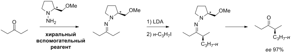 Если в субстрате отсутствует стереонаправляющий хиральный атом, можно использовать хиральный вспомогательный реагент, который образует аддукт с субстратом. При этом сам субстрат становится хиральным, и дальнейшие процессы с его участием протекают энантиоселективно. По завершении синтеза вспомогательный реагент удаляется. Недостатком данного подхода является необходимость двух дополнительных стадий для введения и удаления хирального вспомогательного реагента. Кроме того, сам вспомогательный реагент используется в стехиометрическом количестве, что может значительно увеличить стоимость синтеза[3].