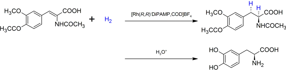 Первые методы были разработаны У. Ноулзом и Р. Ноёри. В 1968 году Ноулз заменил ахиральные трифенилфосфиновые лиганды в катализаторе Уилкинсона на хиральный фосфиновый лиганд, получив первый хиральный катализатор[5]. Данная методология была развита перебором различных фосфиновых лигандов для повышения энантиомерного избытка и применена в промышленном синтезе L-DOPA[6].