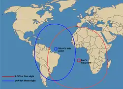 Определение координат по одновременно наблюдаемым Солнцу и Луне: синий — круг равных высот Луны, красный — Солнца