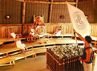 - с берёзовым веником — смесь немецкого ауфгусса и финских или русских традиций использования берёзовых веников в парилке