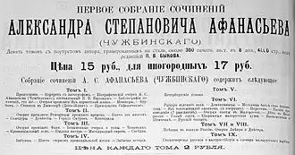 - Собрание сочинений Александра Степановича Афанасьева (Чужбинского) / Под ред. П. В. Быкова. Т. 1-9. — С.-Петербург: Книгоиздательство Герман Гоппе, 1890.