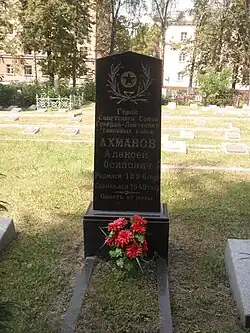 17 ноября 1949 года генерал-лейтенант танковых войск Алексей Осипович Ахманов покончил жизнь самоубийством[1]. Похоронен на Военном кладбище в Минске.