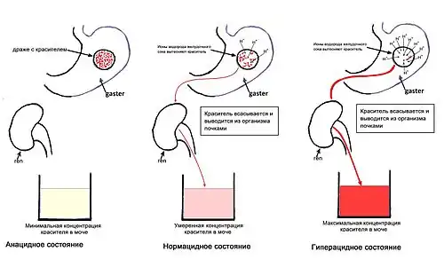 - гиперацидное состояние — ситуация противоположна: избыток ионов водорода практически вытесняют весь краситель из драже, чрезмерно всасывание и выведение красителя ведёт к интенсивному окрашиванию мочи;
