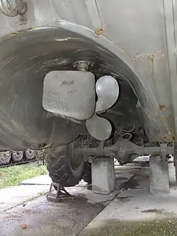 Носовой отсек – это герметизируемое моторное отделение с установленным шестицилиндровым двигателем ЗИС-123 (модель 485) от БТР-152. Двигатель рабочего объёма 5,55 л имел мощность 112 л.с., нижнее расположение клапанов, степень сжатия 6,5 и карбюратор типа К-84 падающего потока, с двумя смесительными камерами и ограничитель оборотов на 3100 об/мин. Двигатель мог работать на бензине марки А-70 или Б-70. Для слива масла из картера двигателя были предусмотрены вывинчивающиеся пробки в днище. Носовой отсек сверху прикрывался палубой с двумя люками, фарами, приёмником дополнительного воздухопротока и шкиперским имуществом. Задний люк открывал доступ к моторному отделению, а передний – к системе охлаждения. Для охлаждения двигателя при движении по суше служили воздухопротоки и люк в палубе, через которые воздух поступал в радиатор; на воде — теплообменник, охлаждаемый забортной водой. Три верхние серьги в носовой части служили для буксировки амфибии по суше и воде.