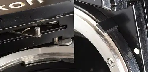 - Установка таких объективов на современные фотоаппараты может повредить камеру из-за несовпадения заднего торца кольца диафрагмы с ответной частью байонета камеры, вокруг которого расположено подпружиненное кольцо с «лапкой». Их использование возможно только после переделки, описанной ниже в разделе AI’d[8]. Некоторые профессиональные фотоаппараты, рассчитанные на объективы AI и более поздние, предусматривали откидную «лапку» поводка, позволяющую устанавливать старую оптику, однако в этом случае сопряжение с экспонометром камеры невозможно.