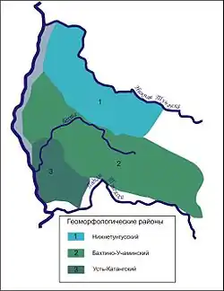Согласно геоморфологическому районированию Воскресенского С. С., бассейн реки Бахта располагается в геоморфологической стране «равнины — плоскогорья и низменности Восточной Сибири», провинции Сибирское плоскогорье, области Североэвенкийское плато и делится на три района: Усть-Катангский (нижняя часть течения р. Бахта, начиная с её выхода на Западно-Сибирскую плиту вплоть до устья), Нижнетунгусский (северная центральная часть) и Бахтино-Учаминский (основная часть бассейна).