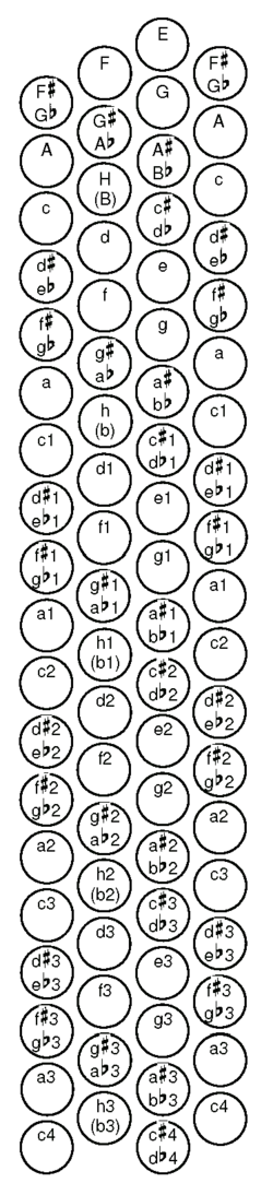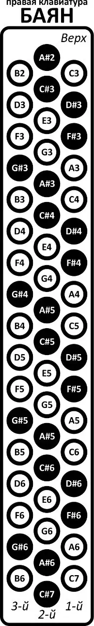 2. Основной ряд басов (диапазон от Фа контроктавы до Ми большой октавы[17][18]). Его составляет повторяющаяся последовательность ступеней гаммы до мажор или ля минор (семь белых кнопок), далее идёт последовательность нот, завершающих хроматический звукоряд (пять чёрных кнопок). Кнопки в ряду расположены таким образом, что между любыми двумя соседними кнопками образуется интервал в чистую квинту (3,5 тона) или его обращение в чистую кварту (2,5 тона). Иными словами, рядом с любой кнопкой, принятой за тонику, двумя соседними кнопками оказываются доминанта (сверху) и субдоминанта (снизу).