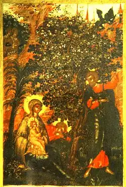 - Отдых Святого семейства (часто изображается пальма, чудесным образом склонившая свою крону, чтобы укрыть Деву Марию от зноя);