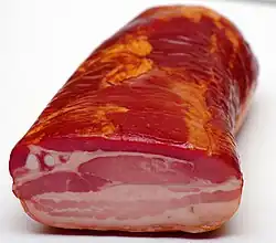 - Челюстный бекон — это солёные и копчёные свиные щеки[17]. Итальянская разновидность челюстного бекона — гуанчале, которая приправляется и вялится, но не коптится.