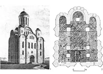 В центральной части детинца находились храмы, княжеские и боярские терема, епископский двор. Большое строительство вёл в Белгороде Киевском обосновавшийся здесь в XII веке Рюрик Ростиславич. Помимо нового собственного двора он воздвиг в 1197 году на месте прежнего деревянного храма большой шестистолпный собор Апостолов — выдающийся памятник древнерусской архитектуры. Во время раскопок раскрыты фундаменты храма, полы, частично стены и другие конструкции[2]. Рядом с собором Апостолов были открыты фундаменты ещё одного довольно крупного четырёхстолпного храма, в котором в 1189 году был погребён епископ Максим.