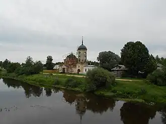 На берегу Тверцы Никольский монастырь и надвратная колокольня бывшей Николо-Столпенской пустыни.