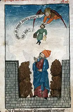 Даниил убивает дракона, бросая ему в пасть тесто, состоящее из смолы, жира и волос; проглотив это тесто, дракон лопается. За что Даниила бросают в ров со львами, но звери не трогают его, а принесённый ангелом из Иудеи пророк Аввакум доставляет ему пищу.