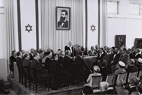 Давид Бен-Гурион 14 мая 1948 года зачитал Декларацию независимости Израиля и возглавил молодое государство. Под руководством Бен-Гуриона Израиль отстоял свою независимость в Арабо-израильской войне 1947—1949 годов, существенно повлиял на создание Армии обороны Израиля (ЦАХАЛ) в 1948 году. Именно он заложил фундамент еврейского государства, напрямую повлияв на решение ключевых вопросов и формирование основных институтов Государства Израиль.