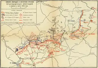 После Праснышской операции командующий Северо-Западным фронтом Рузский должен был развивать успех и вернуться к январскому плану вторжения в Восточную Пруссию, но ставке Верховного главнокомандующего к этому времени отказались от разработки нового наступления в Восточной Пруссии. 1 марта начальник Генерального штаба Н. Н. Янушкевич объявил Рузскому о том, что начинать новое наступление в Восточной Пруссии не стоит, а вместо этого следует наносить сильные короткие удары, преследовать только до границы и ни в коем случае не ослаблять армии на левом берегу Вислы.