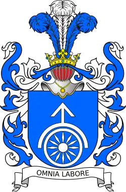 В лазоревом щите половина серебряного кольца, концами вниз. На кольце серебряное острие от копья. Внизу серебряное колесо с восемью спицами.