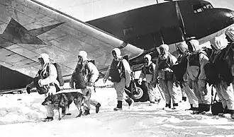 Посадка десантников ВДВ ВС Союза ССР, с сапёрной собакой на самолёт.