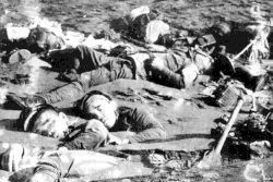 ![]() Мёртвые японские солдаты, погибшие во время атаки на позиции морской пехоты США, лежащие на пляже в устье бухты Аллигатор, Гуадалканал после боя 21 августа 1942 года. | |||