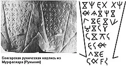 - ↑ Профессор Рашо Рашев статья «За произхода на прабългарите» — «Новите проучвания показват, че в Източна Европа са съществували две рунически системи, които са част от общо шестте рунически писмености, разпространени през ранното средновековие от Монголия до Унгария. Не може да бъде изключена възможността руническо писмо да са използвали не само тюрките, но и други етнически групи. Може би най-добрият пример са рунообразните надписи от старобългарски манастири при Мурфатлар и Равна»