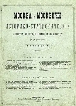 - ↑ Сборник материалов для изучения Москвы и Московской губернии, издаваемый Московским губернским статистическим комитетом / Под ред. Николая Бочарова. Вып. 1. Москва: Губ. тип., 1864.