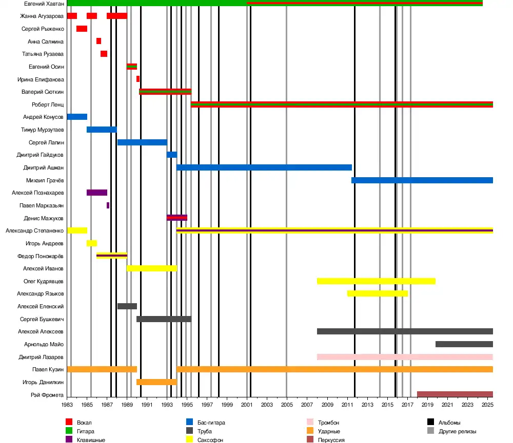- Александр Степаненко — клавишные, саксофон, флейта, губная гармоника, гитара (lap steel), аккордеон (1983—1985, 1994 — наст. время)