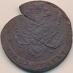 Выкус или луна. Так называется нарушение круглой формы монеты, произошедшее на этапе вырубки заготовок из металлического листа. Заготовки вырубаются обычно рядами, одним за другим. В случае, если шаг подачи листа под следующую вырубку будет больше, чем надо, будет перерасход металла (из одного листа выйдет меньше заготовок). Если же шаг будет меньше оптимального, вырубаемые участки наложатся друг на друга, а заготовки будут нести на себе дугообразный вырез, «выкус». Монета может иметь один выкус, два или три, в зависимости от расположения вырубных пуансонов и от их смещения. Бывают выкусы, называемые «край листа». Как понятно из названия, они образуются, когда монета вырублена частично за краем листа. В этом случае граница выкуса прямая, а не дуговая. Обычно таких браков на монете не больше одного. Иногда на монете бывает видно больше трёх дефектов кругового канта, причём располагаются они друг напротив друга. Это настоящие выкусы и их антиподы, иногда называемые «антивыкусами». Антивыкусы образуются напротив больших выкусов, это связано с процессами, происходящими с металлом во время чеканки, грубо говоря, металл не стремится заполнить рисунок штемпеля и круговой кант напротив выкуса, большой пустоты. Также у границ выкусов имеется характерное постепенное схождение на нет кругового канта монеты.