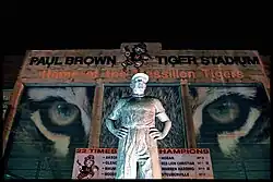 В течение девяти лет Браун изобрёл подробный список расстановок и сетов плейбука, проверяя своих игроков на знание этого. Он также положил начало практике посылать игры своему квотербеку с боковой линии, используя жесты рукой. Его общий рекорд в школе был 80-8-2, включая серию из 35 побед.[32] Между 1935 и 1940 годами команда пять раз выиграла чемпионат штата по футболу и четыре раза выиграла национальный чемпионат по футболу среди школьников, опередив соперников на 2393 очка до 168 за этот период. После первых поражений от Кантона «Тигры» победили «Бульдогов» шесть раз подряд.[33][34] Между 1935 и 1940 годами команда пять раз выиграла чемпионат штата по футболу и четыре раза выиграла национальный чемпионат по футболу среди школьников, опередив соперников на 2393 очка до 168 за этот период. После первых поражений от Кантона «Тигры» победили «Бульдогов» шесть раз подряд.[33]