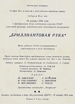 «Бриллиа́нтовая рука́» — советская эксцентрическая комедия, снятая в 1968 году режиссёром Леонидом Гайдаем. Сценарий написан Морисом Слободским, Яковом Костюковским и Леонидом Гайдаем. В основе картины — история о том, как зарубежные контрабандисты ошибочно приняли советского туриста Семёна Семёновича Горбункова за агента-перевозчика Геннадия Козодоева. Сюжет раскручивается вокруг настойчивых, но безуспешных попыток злоумышленников вернуть себе бриллианты, спрятанные в гипсовой повязке. Образ главного героя создавался сценаристами с учётом актёрских данных Юрия Никулина, который попал в съёмочную группу без кинопроб. В фильме также участвовали Андрей Миронов, Анатолий Папанов, Нонна Мордюкова, Светлана Светличная, Станислав Чекан, Владимир Гуляев, Нина Гребешкова и другие артисты. Съёмки проходили с апреля по ноябрь 1968 года в Сочи, Адлере, Туапсе, Новороссийске, Гжатске, Павловской Слободе, на натурных объектах Москвы и в павильонах «Мосфильма». «Зарубежные сцены» снимались в Баку. При работе над отдельными сценами создатели фильма использовали комбинированные съёмки, механические спецэффекты и другие технологии.
