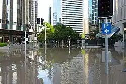 - 2011 — сильнейшее за 120 лет наводнение. Затоплено свыше 17 тыс. зданий в городе. Река не достигла ожидавшегося катастрофического уровня, но тем не менее, поднялась выше уровня 1974 года, и разрушения весьма значительны[7]. Загорелся центральный стадион Suncorp[8]. По рекам проходят 2-4 метровые волны (континентальный цунами[9]). Река поднялась до отметки 4,46 метров[10], превзойдя уровень 1974 года. В зоне затопления оказалась территория, превышающая по площади размеры Германии и Франции вместе взятые, экономические потери исчисляются миллиардами долларов.